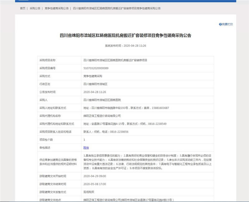 【綿陽正信·招標部消息】我公司受綿陽市肛腸病醫(yī)院委托,經(jīng)綿陽市涪城區(qū)財政局審批,對綿陽市肛腸病醫(yī)院機房搬遷擴容裝修項目擬采用競爭性磋商方式進行采購,2020年04月28日已在四川省政府采購網(wǎng)及綿陽政府采購網(wǎng)將綿陽市肛腸病醫(yī)院機房搬遷擴容裝修項目競爭性磋商采購公告掛網(wǎng)公示。