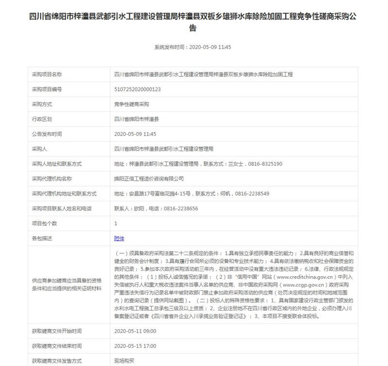 【綿陽正信·招標(biāo)部消息】我公司受梓潼縣武都引水工程建設(shè)管理局委托,經(jīng)綿陽市梓潼縣財政局審批,對梓潼縣武都引水工程建設(shè)管理局梓潼縣雙板鄉(xiāng)雄獅水庫除險加固工程擬采用競爭性磋商方式進行采購,2020年05月09日已在四川省政府采購網(wǎng)及綿陽政府采購網(wǎng)將梓潼縣武都引水工程建設(shè)管理局梓潼縣雙板鄉(xiāng)雄獅水庫除險加固工程競爭性磋商采購公告掛網(wǎng)公示。