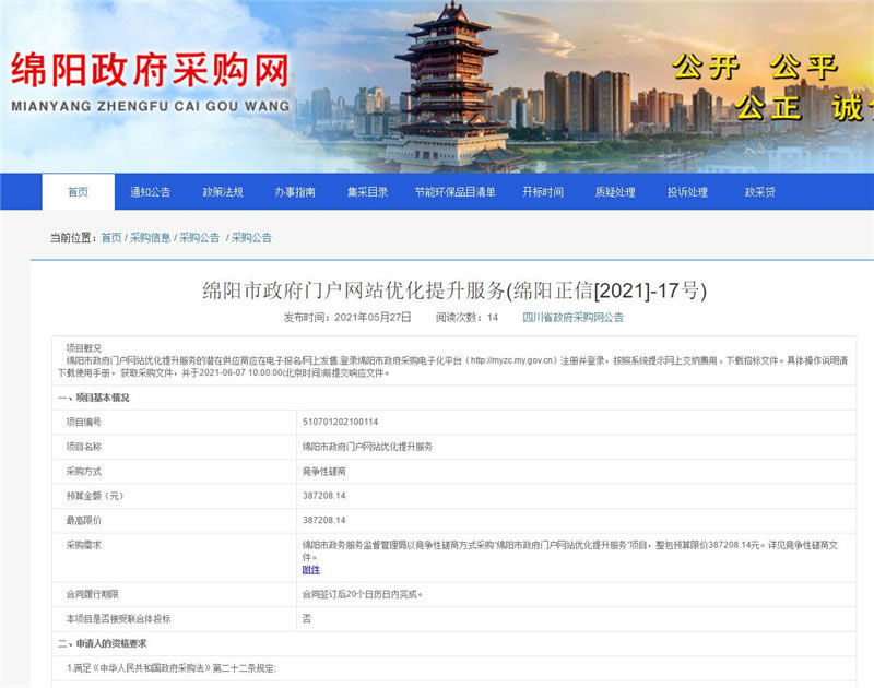 【綿陽正信·招標部消息】我公司受綿陽市政務(wù)服務(wù)監(jiān)督管理局委托,對綿陽市政府門戶網(wǎng)站優(yōu)化提升服務(wù)擬采用競爭性磋商方式進行采購,本項目于2021年05月27日在四川省政府采購網(wǎng)及綿陽市政府采購網(wǎng)公示,預(yù)計于2021年06月07日10:00在綿陽市安昌路17號富臨花園四樓15號開標。