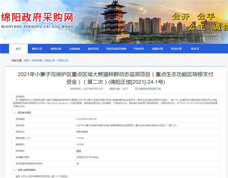 【綿陽正信·招標(biāo)部消息】我公司受四川省綿陽市北川羌族自治縣小寨子溝國家級自然保護(hù)區(qū)管理處委托,對2021年小寨子溝保護(hù)區(qū)重點(diǎn)區(qū)域大熊貓種群動態(tài)監(jiān)測項(xiàng)目(重點(diǎn)生態(tài)功能區(qū)轉(zhuǎn)移支付資金)(第二次)擬采用競爭性磋商方式進(jìn)行采購,本項(xiàng)目于2021年07月12日在四川省政府采購網(wǎng)和綿陽市政府采購網(wǎng)掛網(wǎng)公示,預(yù)計(jì)于2021年07月26日10:00在綿陽市安昌路17號富臨花園四樓15號開標(biāo)。