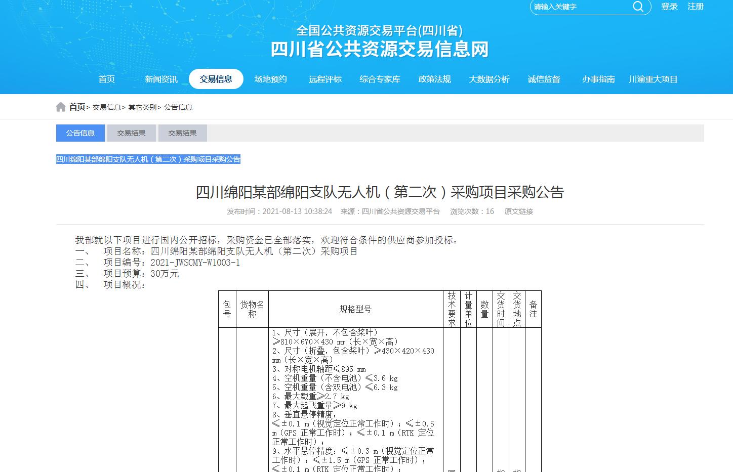 【綿陽正信·招標(biāo)部消息】我公司受四川綿陽某部綿陽支隊委托,對四川綿陽某部綿陽支隊無人機(第二次)采購項目擬采用公開招標(biāo)方式進行采購,本項目于2021年08月13日在《全國公共資源交易平臺(四川?。饭?,于2021年09月6日13:30在綿陽市涪城區(qū)三江西路北段1號桃花島商業(yè)街第4幢商業(yè)樓(詳見一樓電子顯示屏)開標(biāo)。