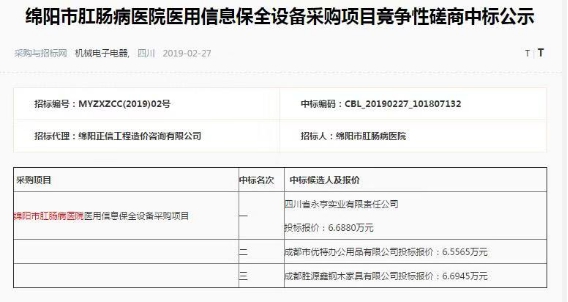 【綿陽正信·招標(biāo)部消息】受綿陽市肛腸病醫(yī)院委托由我公司招標(biāo)代理部代理的“綿陽市肛腸病醫(yī)院醫(yī)用信息保全設(shè)備采購項目”通過在四川省政府采購網(wǎng)掛網(wǎng)招標(biāo),于2019年2月25日在業(yè)主單位、監(jiān)督部門的監(jiān)督下,在綿陽正信工程造價咨詢有限公司進(jìn)行了項目開評標(biāo)活動,并于2019年2月27日完成項目中標(biāo)公示。