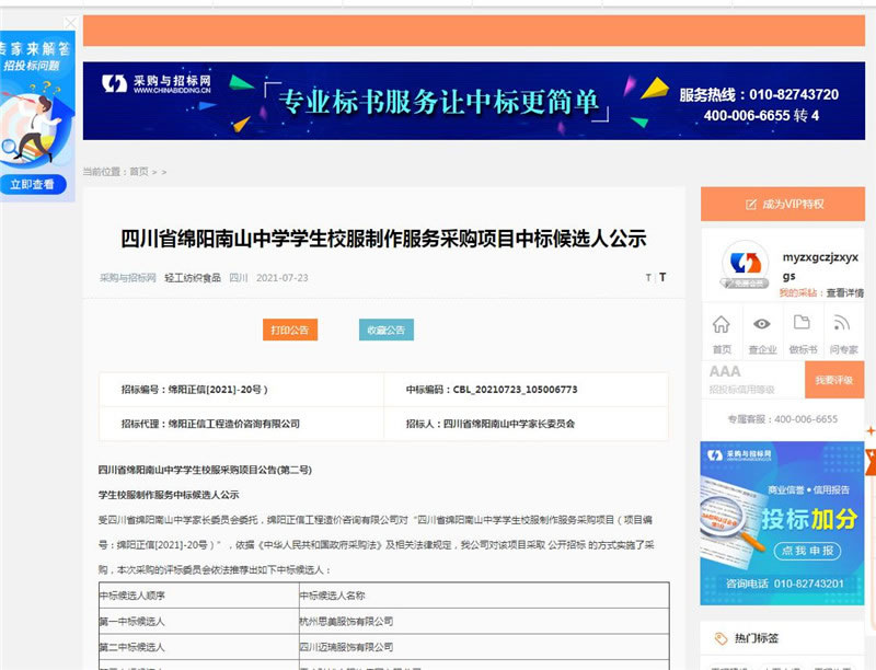 【綿陽正信·招標部消息】我公司受四川省綿陽南山中學 四川省綿陽南山中學家長委員會委托,對四川省綿陽南山中學公開征集學生校服設計基礎款式采購項目擬采用公開招標方式進行采購,本項目于2021年06月27日在中國采購與招標網掛網公示,于2021年07月22日14:00在綿陽科創(chuàng)區(qū)劍南路西段388號長興星城3棟2樓11號順利開標。